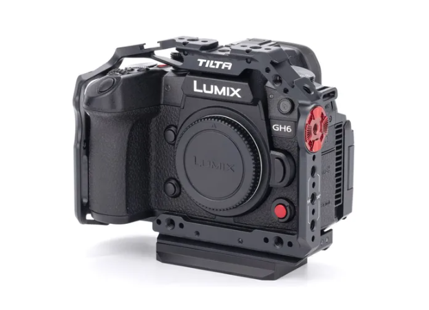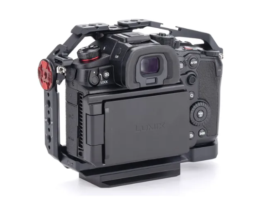 Este suporte completo para câmera oferece proteção para a Panasonic Lumix GH6, ao mesmo tempo em que expande muito as opções para montagem de vários acessórios.